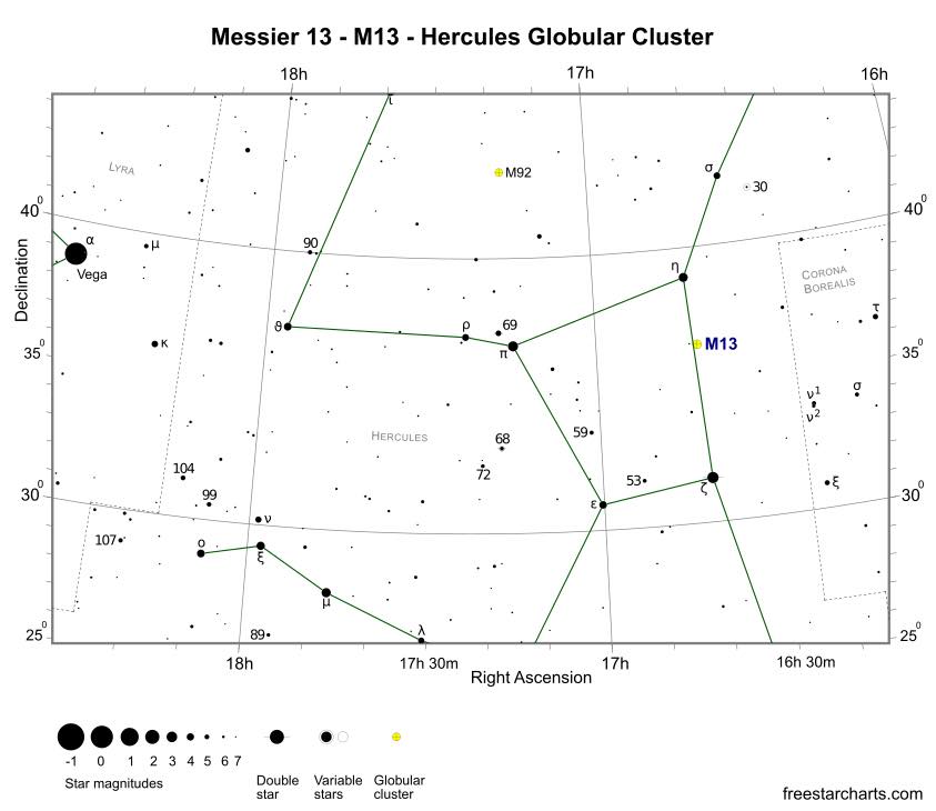 Deze cluster werd ontdekt door de Franse astronoom Charles Messier in 1764 en is een populair onderwerp voor amateurastronomen en sterrenkijkers vanwege zijn prachtige uitstraling. Messier 13 heeft een grootte van ongeveer 145 lichtjaar en bevat meer dan 100.000 sterren. Dankzij zijn helderheid kan het cluster gemakkelijk worden waargenomen met een kleine telescoop.