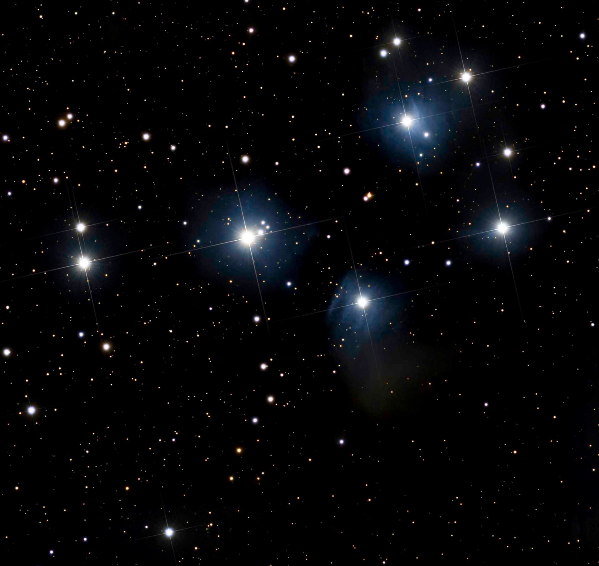Messier 45, beter bekend als de Pleiaden of Seven Sisters, is een open sterrencluster in het sterrenbeeld Stier. Deze cluster is een van de meest opmerkelijke en bekendste clusters aan de nachtelijke hemel, vanwege zijn helderheid en de herkenbare groep sterren.